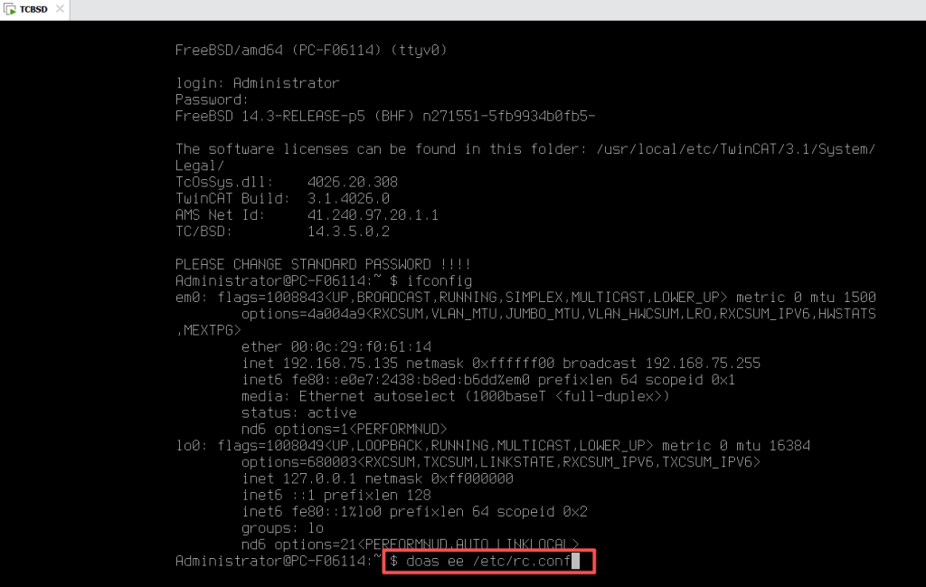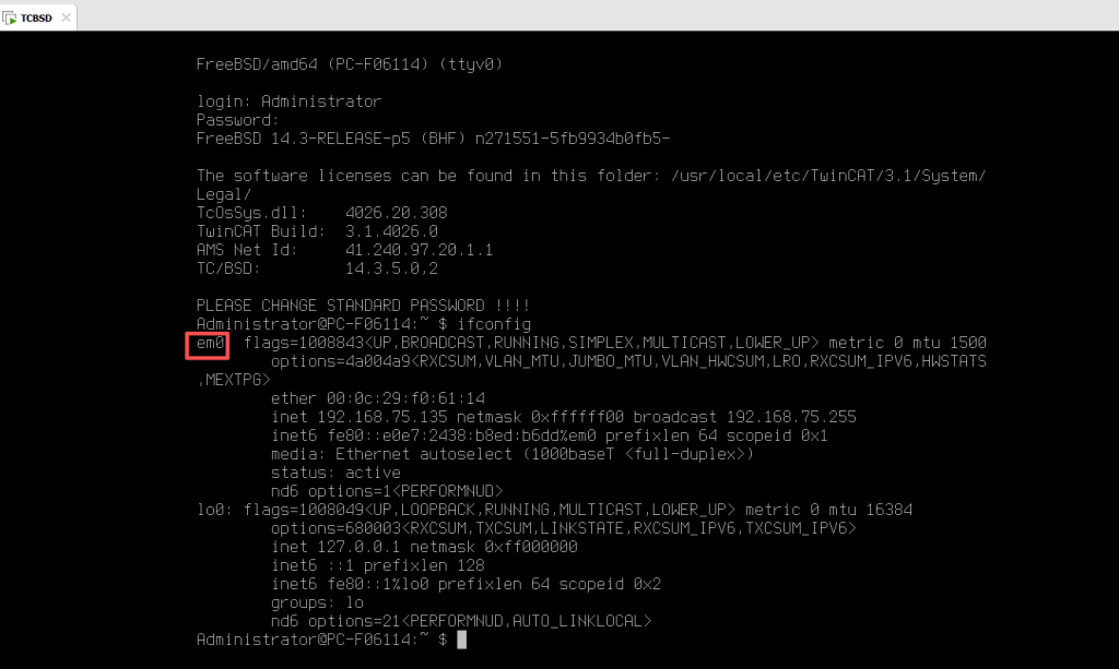 如果倍福的物理机,那就有四个网卡,分别是em0,igb0,igb1,igb2